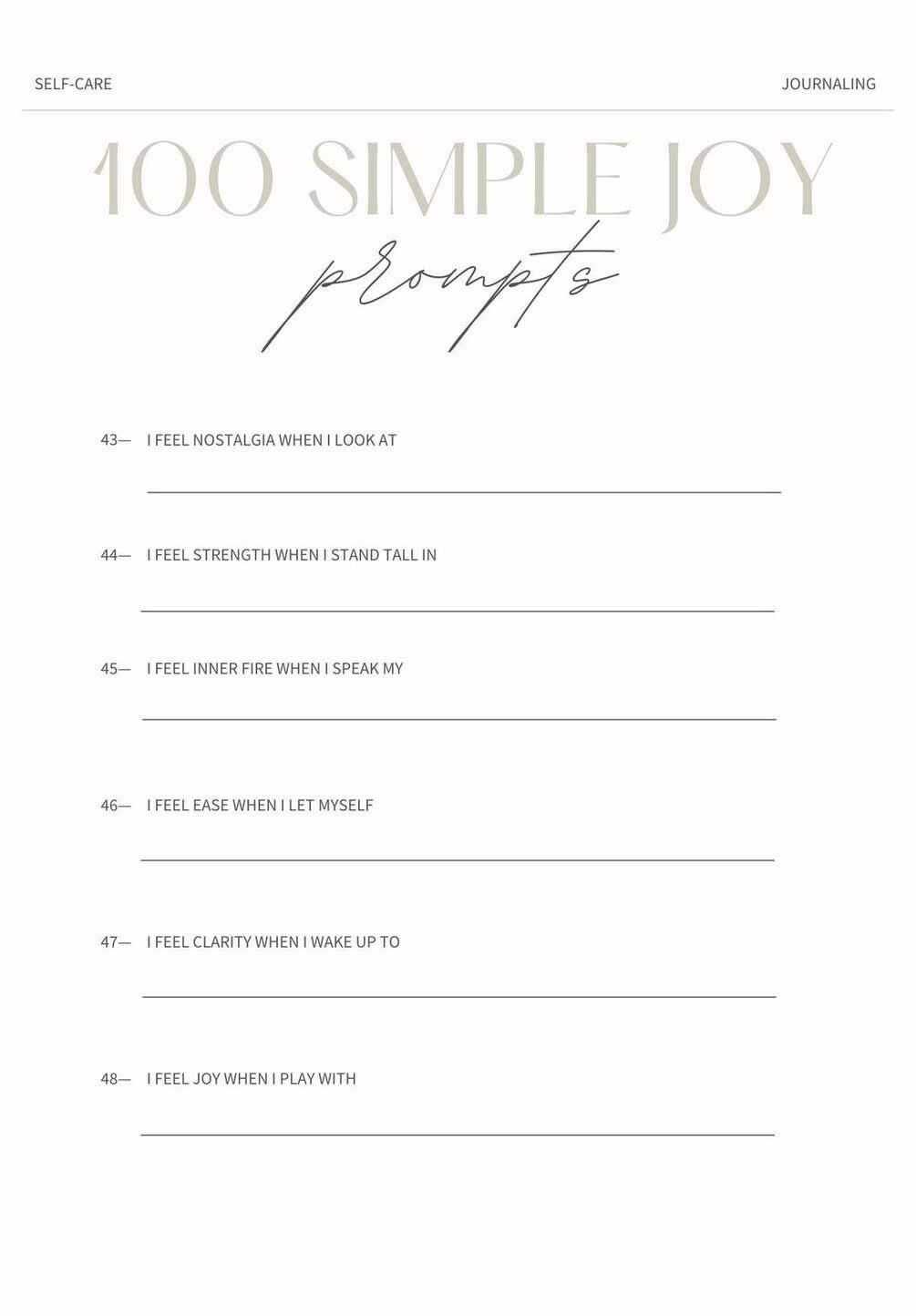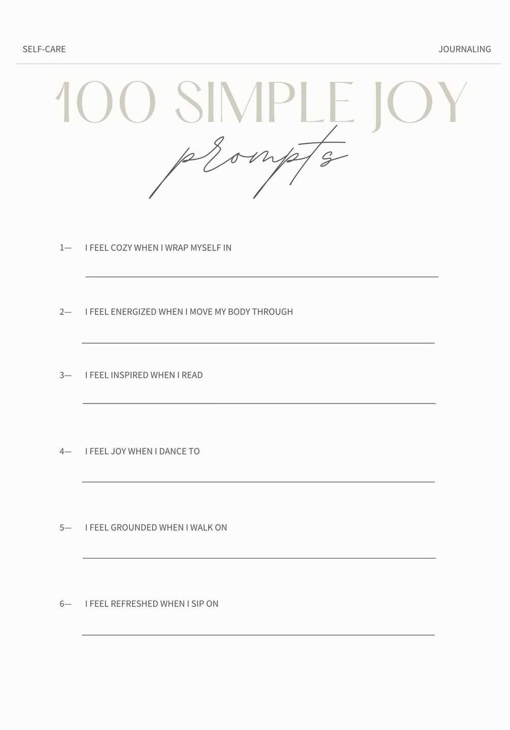The 100 Simple Joy Prompts journal is a gentle, printable guide to help you slow down, tune in and rediscover the magic in your everyday life. Whether you're starting a new mindfulness practice or simply seeking more meaning in the mundane, these prompts will help you notice the light in small moments, the peace in simplicity and the beauty in being fully present.