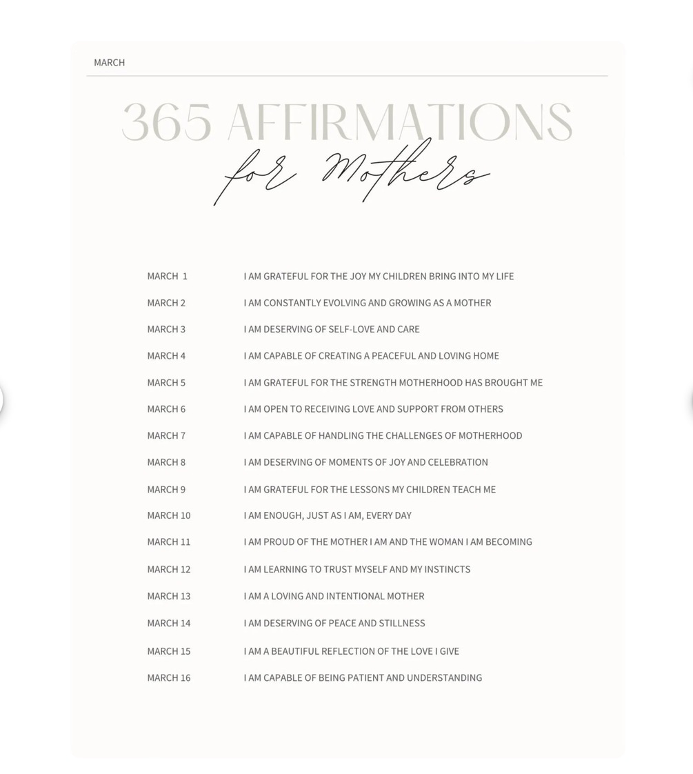 Embrace the beauty, strength, and sacred calling of motherhood with 365 Daily Affirmations for Mothers—a printable journal designed to nourish your spirit, uplift your heart, and help you reclaim moments of peace and self-love throughout the year.