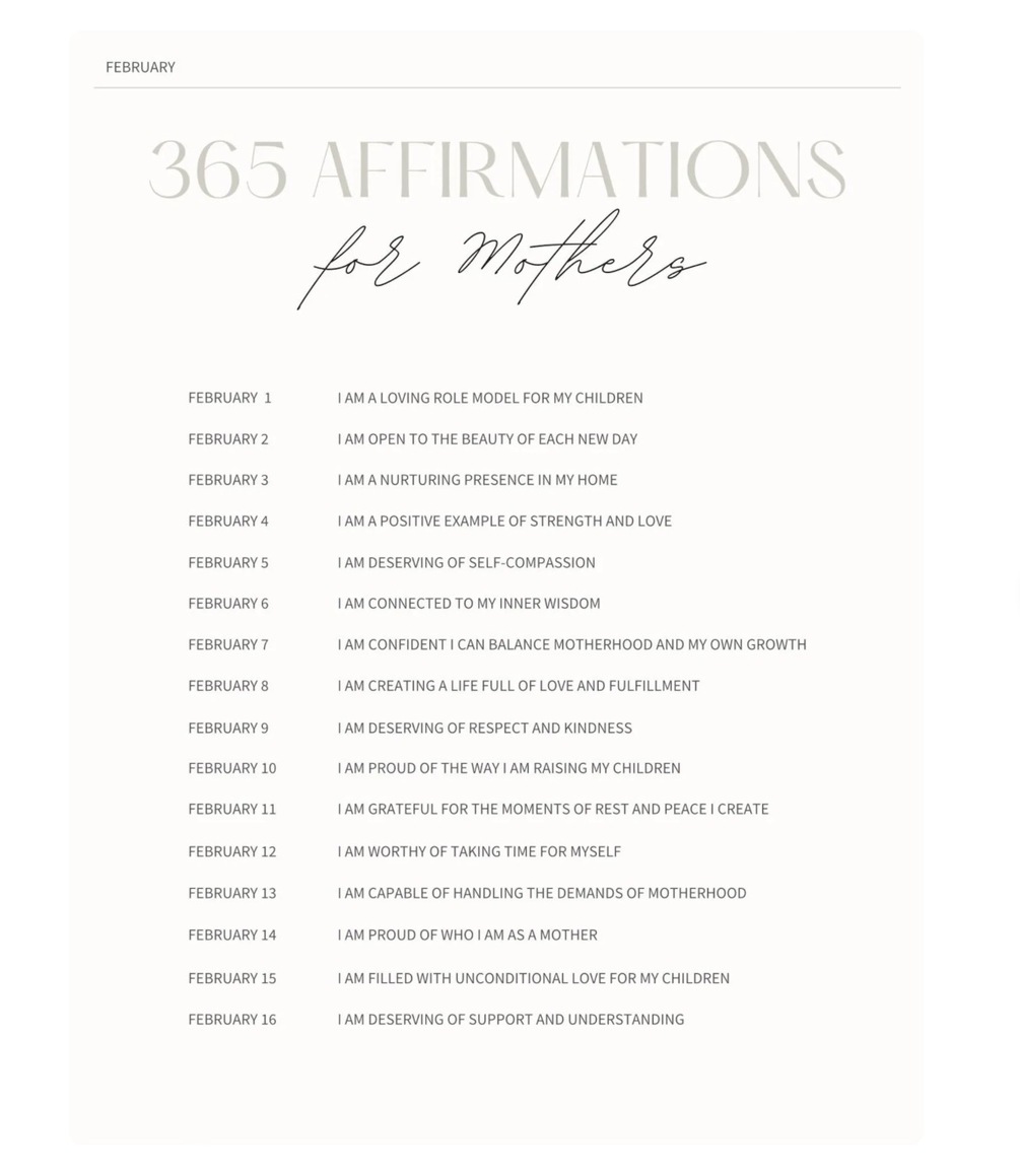 Embrace the beauty, strength, and sacred calling of motherhood with 365 Daily Affirmations for Mothers—a printable journal designed to nourish your spirit, uplift your heart, and help you reclaim moments of peace and self-love throughout the year.