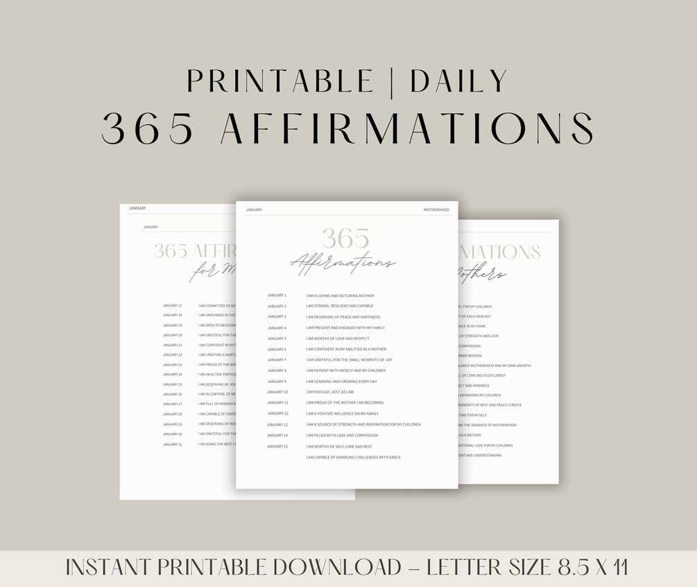 365 Daily Affirmations for Mothers | Printable Journal | A Year of Daily Self Care Healing Words of Mom Affirmations for Motherhood Journey